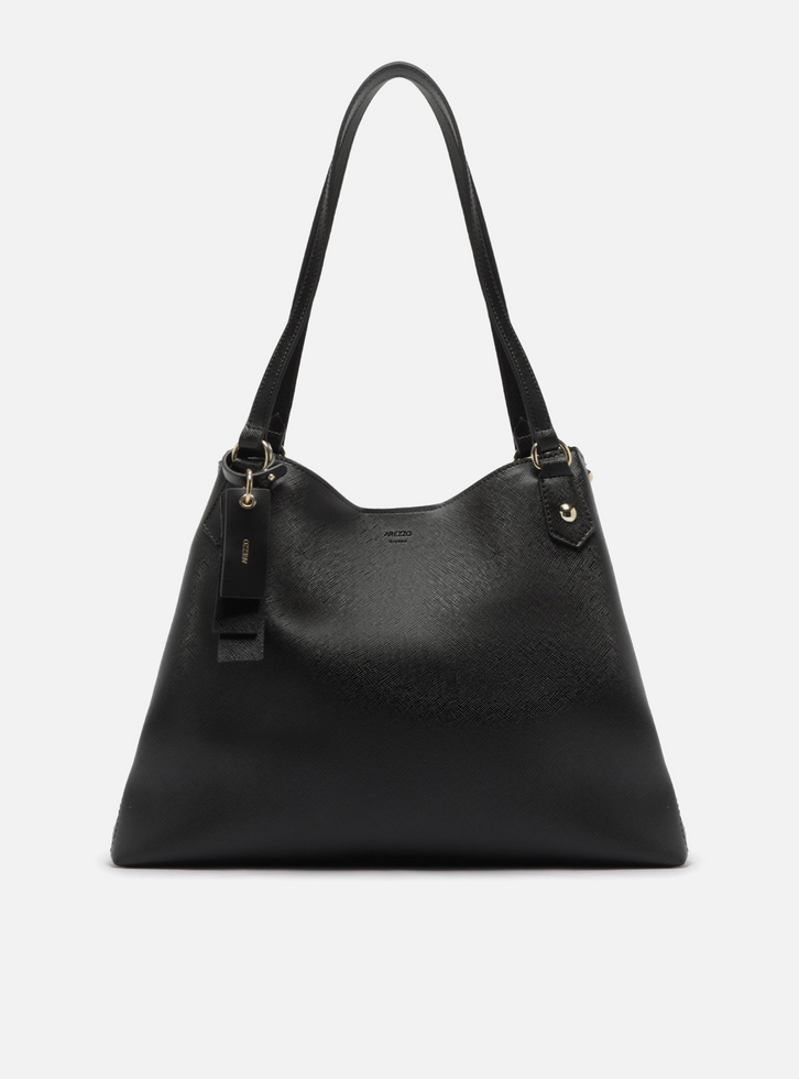 Bolsa feminina hobo grande preta. O acessório tem formato estruturado e acabamento texturizado. Possui duas alças de ombro e três divisórias internas, com fecho central em zíper e fecho superior em ímã. Com rebites nos cantos da capa e bag charm em peças retangulares com nome da marca.
