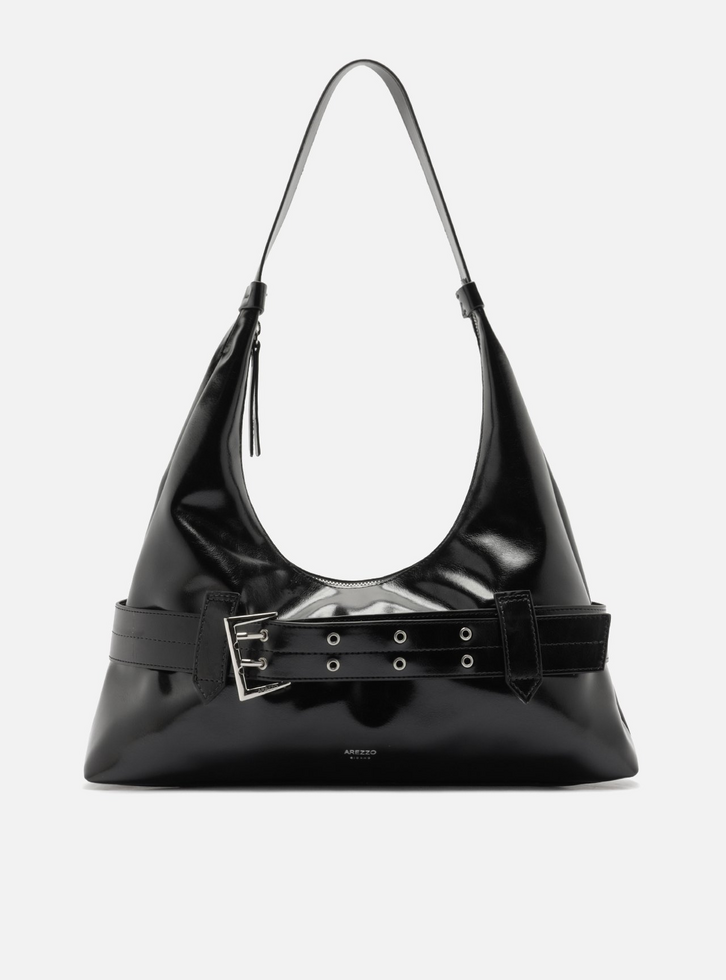 Bolsa hobo grande preta. O acessório tem formato amplo e acabamento envernizado. Traz alça contínua de ombro com conectores em metal nas laterais e detalhe frontal com tira larga e fivela dupla metálica, além de passadores. Possui fecho superior em zíper com puxador e inscrição discreta do nome da marca na parte frontal.