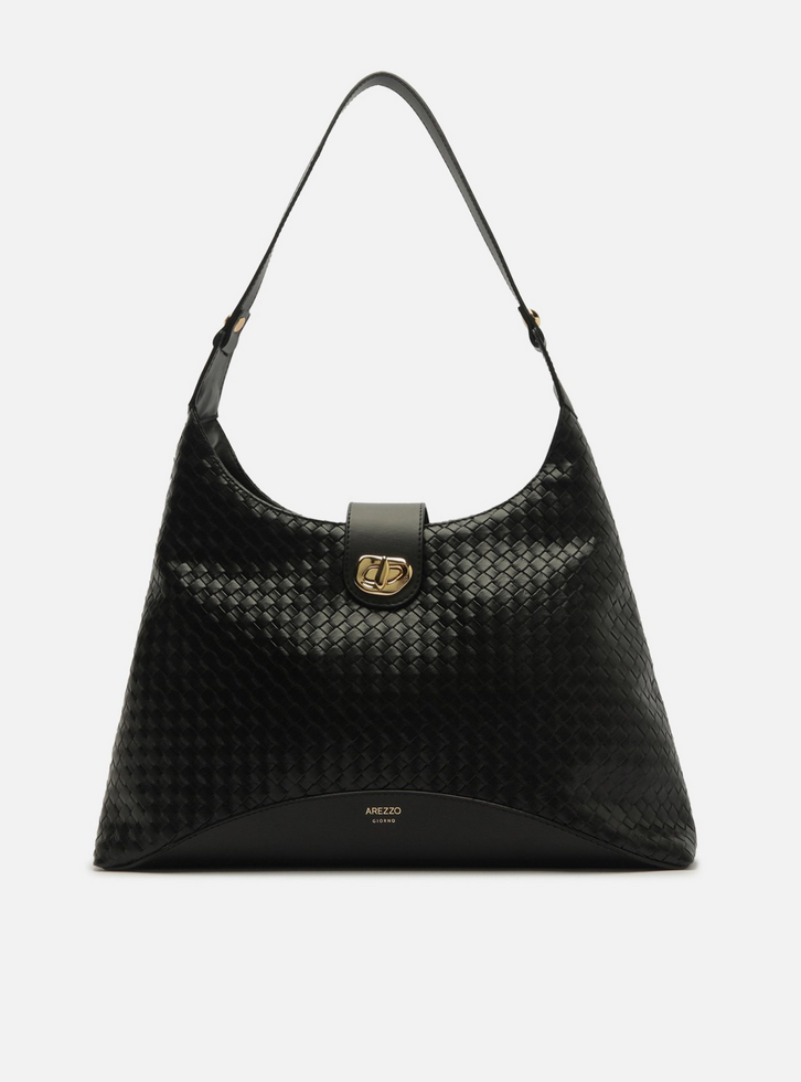 Bolsa hobo grande preta. O acessório tem formato estruturado e acabamento em tressê nas capas. Traz alça única de ombro e fecho superior em zíper. Possui encaixe frontal em lapela e peça metálica com formato orgânico.