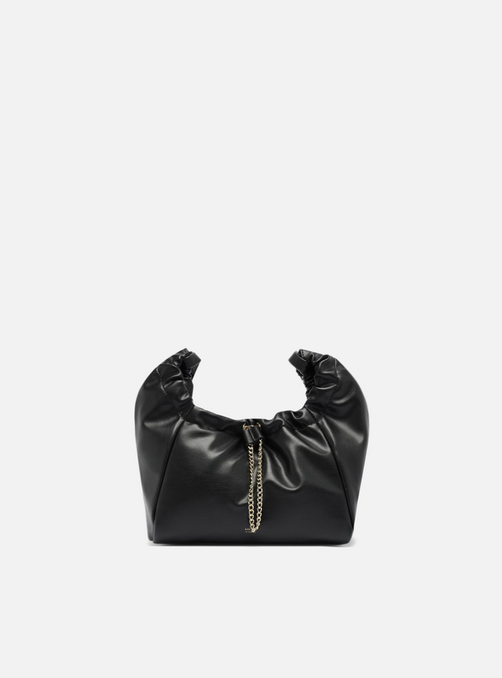 Bolsa hobo preta pequena. O modelo tem formato arredondado e acabamento macio. Possui alça tiracolo, além de fecho superior franzido. Com detalhe em corrente metálica, e inscrição do nome da marca na frontal.