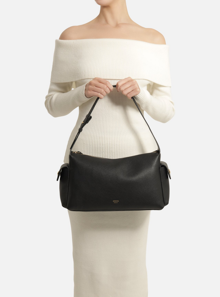 Bolsa Hobo Preta Texturizada Grande Bolsos Laterais