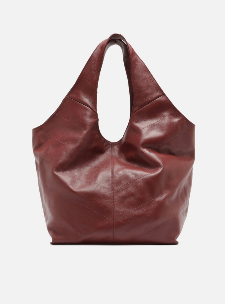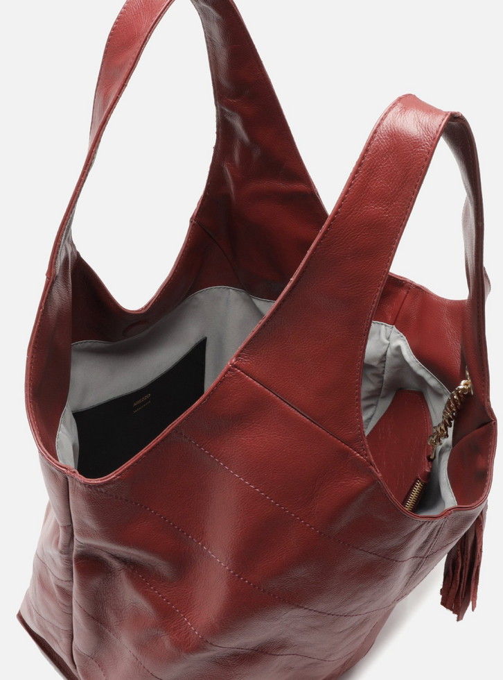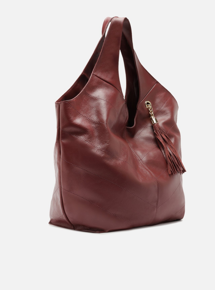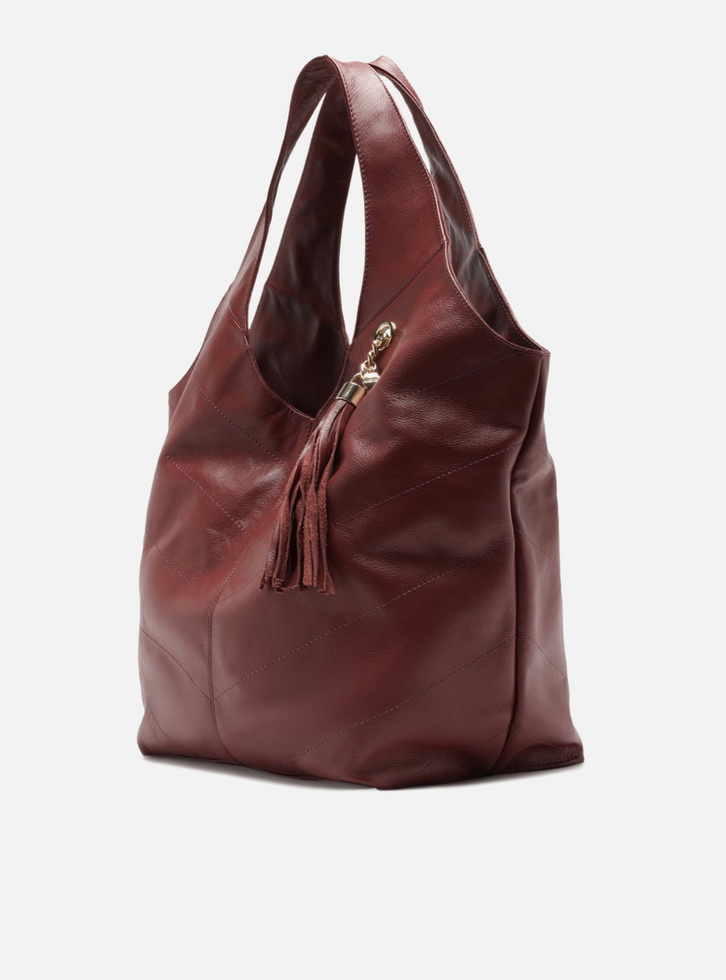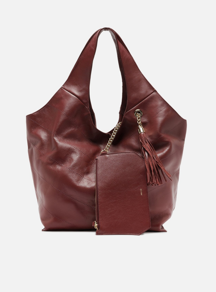 Bolsa hobo grande em couro bordô. O acessório tem formato amplo, maior na parte superior, e acabamento macio. Traz alça de ombro larga e contínua ao corpo da bolsa, além de costuras pesponto nas capas. Possui fecho em zíper e puxador. Com detalhe em barbicacho, tira em corrente com pingente e preso à bolsa por ilhós na capa.