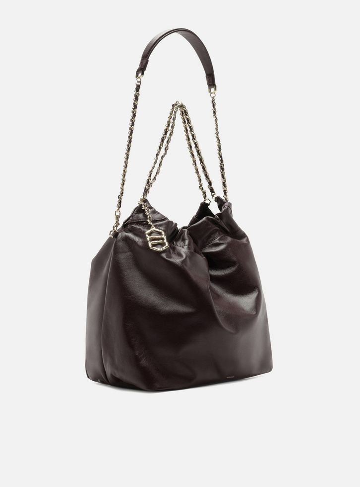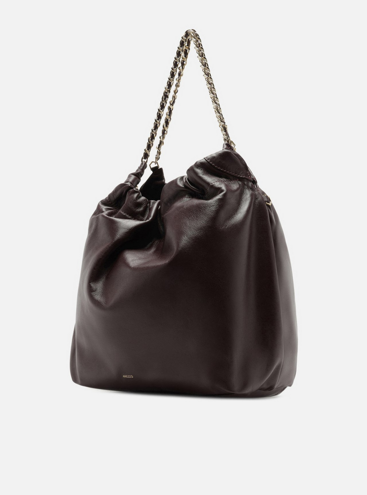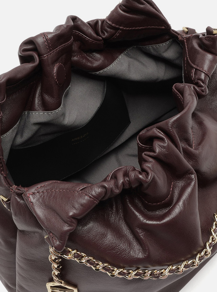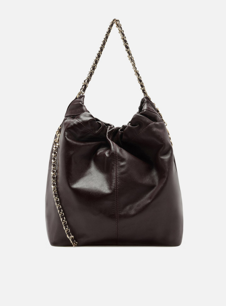 Bolsa hobo grande vermelho de couro. O acessório tem formato retangular, laterais arredondadas e acabamento macio. Traz alça curta de ombro em corrente metálica dupla, mais longa em um dos lados. Possui fecho superior. Com metal geométrico, dourado e vazado preso à bolsa.