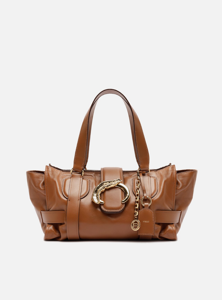 Bolsa marrom. O modelo possui alças médias de ombro, fechamento superior em aba com detalhe de fivela metálica dourada. Com tag personalizada e charm metálico.