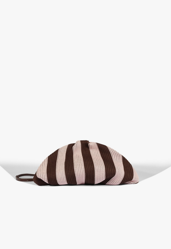 Perfeita para quem ama um acessório de impacto! Esta clutch de mão combina o design oversized e puffy, super em alta, com o charme clássico das listras em tons de marrom e rosa. O acabamento acolchoado não só adiciona uma textura rica e irresistível, mas também confere um ar moderno e luxuoso.