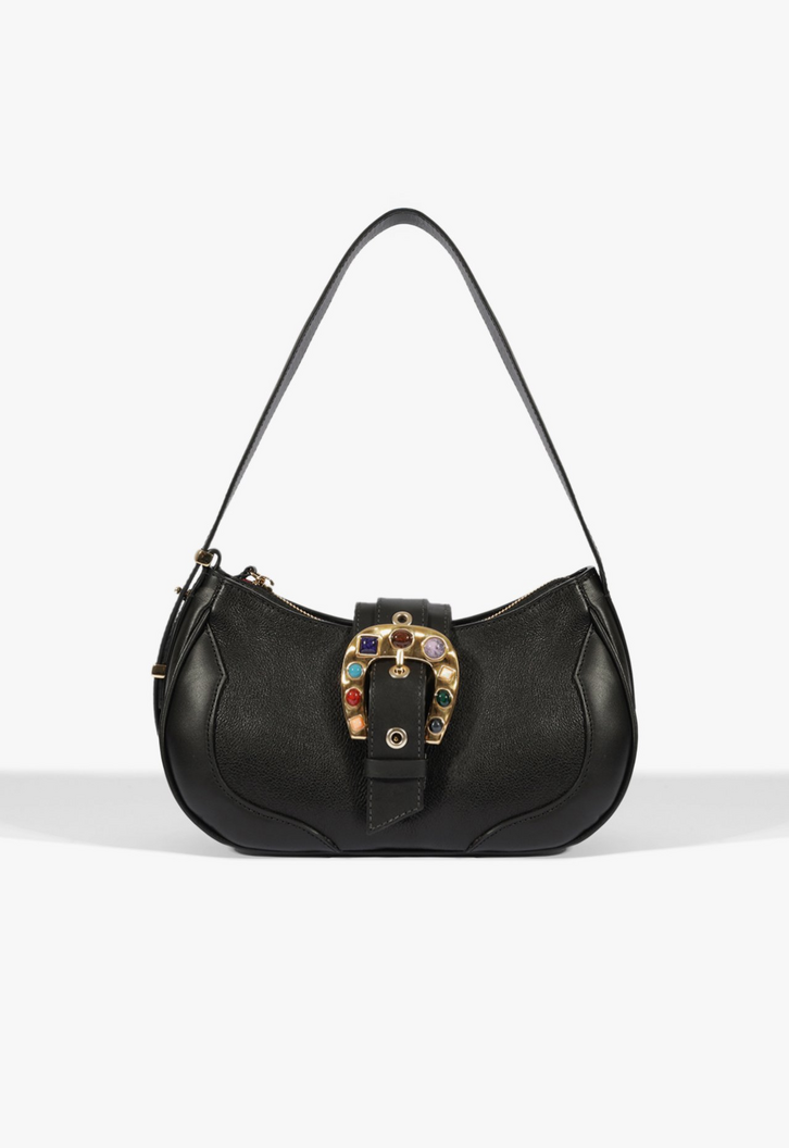 Com estilo boho chic e cheio de personalidade, esta bolsa preta média se destaca pela construção que combina couro e camurça, mix que garante textura e sofisticação ao visual. As fivelas personalizadas nas laterais e a lapela com ilhoses reforçam o design marcante, enquanto o fechamento com zíper oferece praticidade. O toque final fica por conta da fivela frontal com pedraria que adiciona um ar glam e diferenciado à peça. Ideal para compor looks autênticos com charme e atitude! Comprimento da alça: 28 cm | Largura da alça: 3 cm