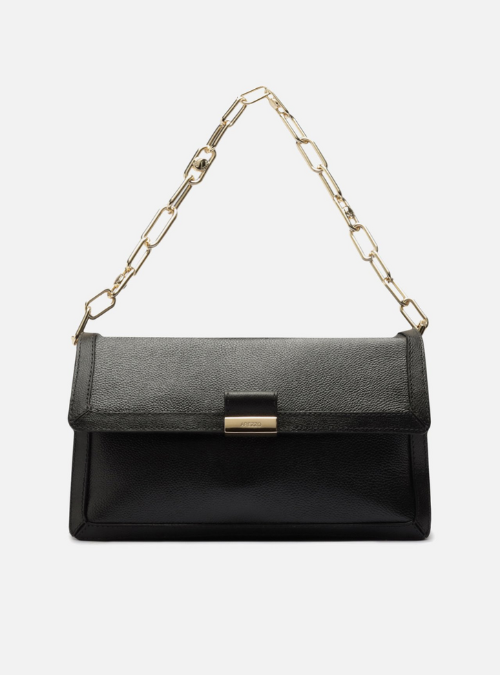 Bolsa satchel grande em couro preta. O acessório tem formato estruturado, acabamento texturizado e moldura lisa. Traz alça lateral regulável e alça extra em corrente metálica dourada, removível. Possui fecho em tampo com imã interno e detalhe frontal em couro com peça metálica dourada e nome da marca.