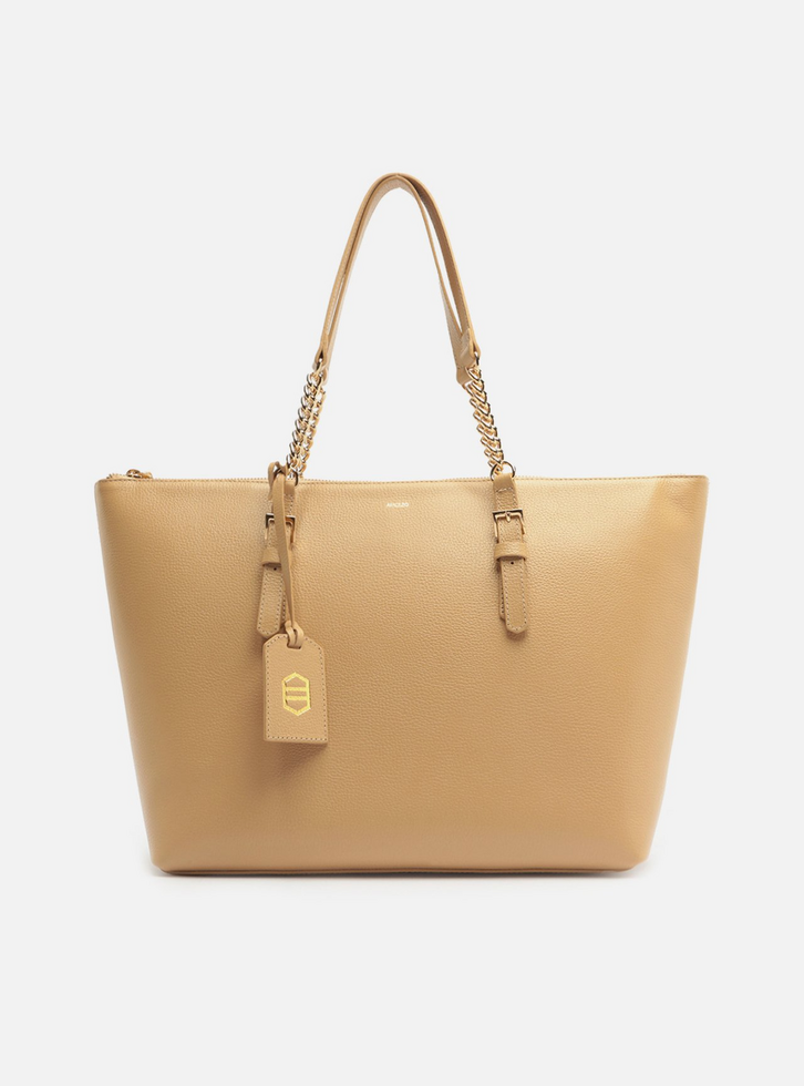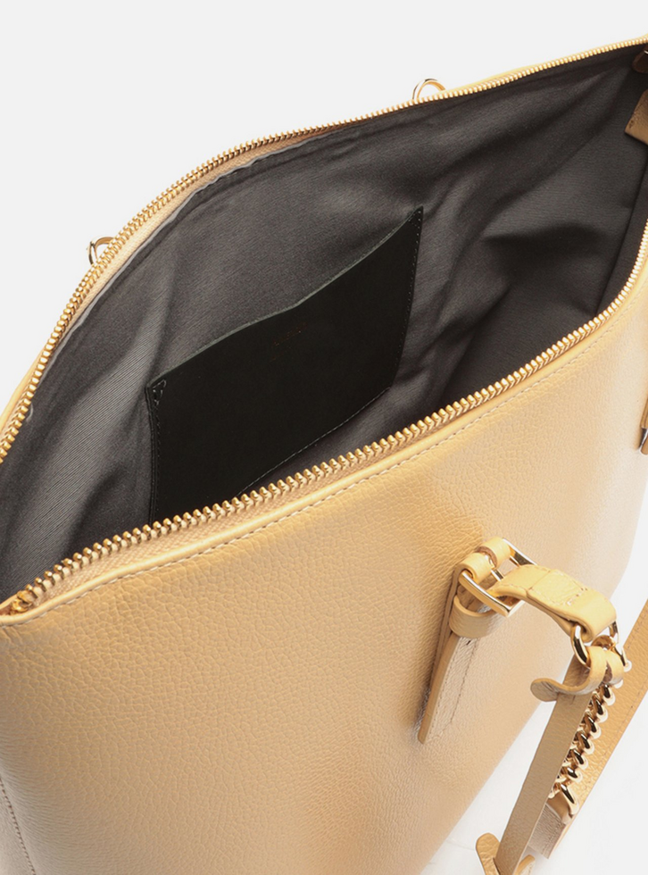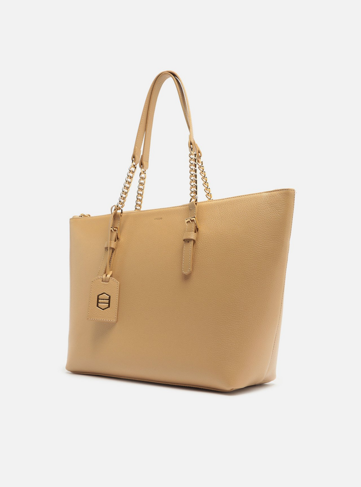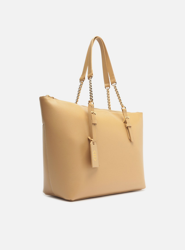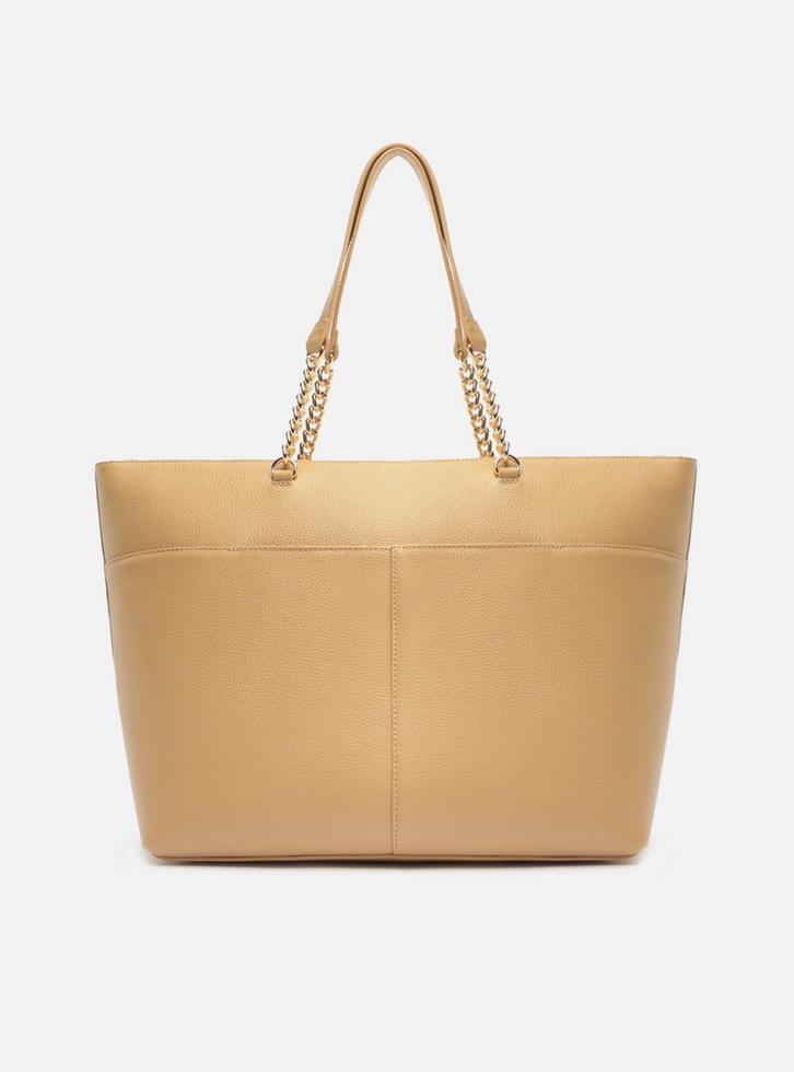 Bolsa feminina shopping grande em couro bege. O acessório tem formato estruturado e acabamento levemente texturizado. Possui duas alças de ombro em tiras de couro, presas por correntes metálicas douradas e que terminam novamente em tiras de couro com ajuste em fivelas. Conta com fecho superior em zíper com puxador e interior amplo. Acompanha bag charm preso por tira à bolsa, com detalhe em metal geométrico dourado.