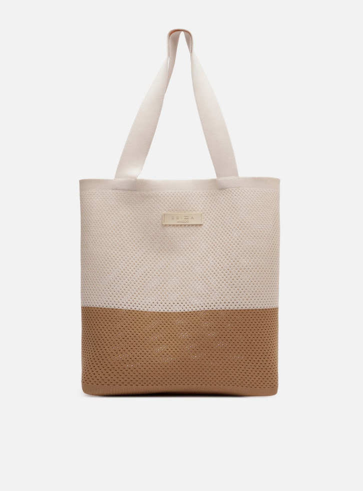 Bolsa shopping média bicolor em crochê, nas cores off-white e bege. O acessório tem formato estruturado, alças largas de ombro e etiqueta personalizada Brizza aplicada na parte frontal.