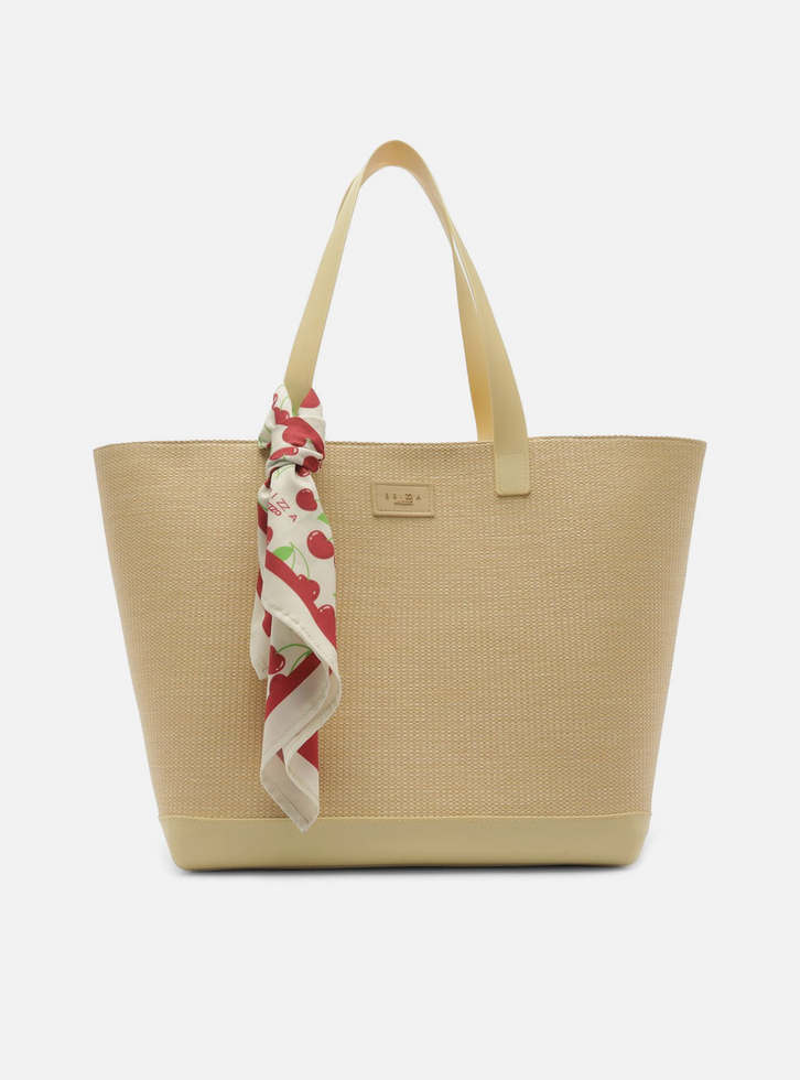 Bolsa shopping grande em ráfia tramada bege. O acessório tem formato estruturado e base em PVC, além de alças de ombro em PVC bege. Possui fechamento superior em zíper, etiqueta personalizada na parte frontal e acompanha lenço removível com estampa de cerejas.
