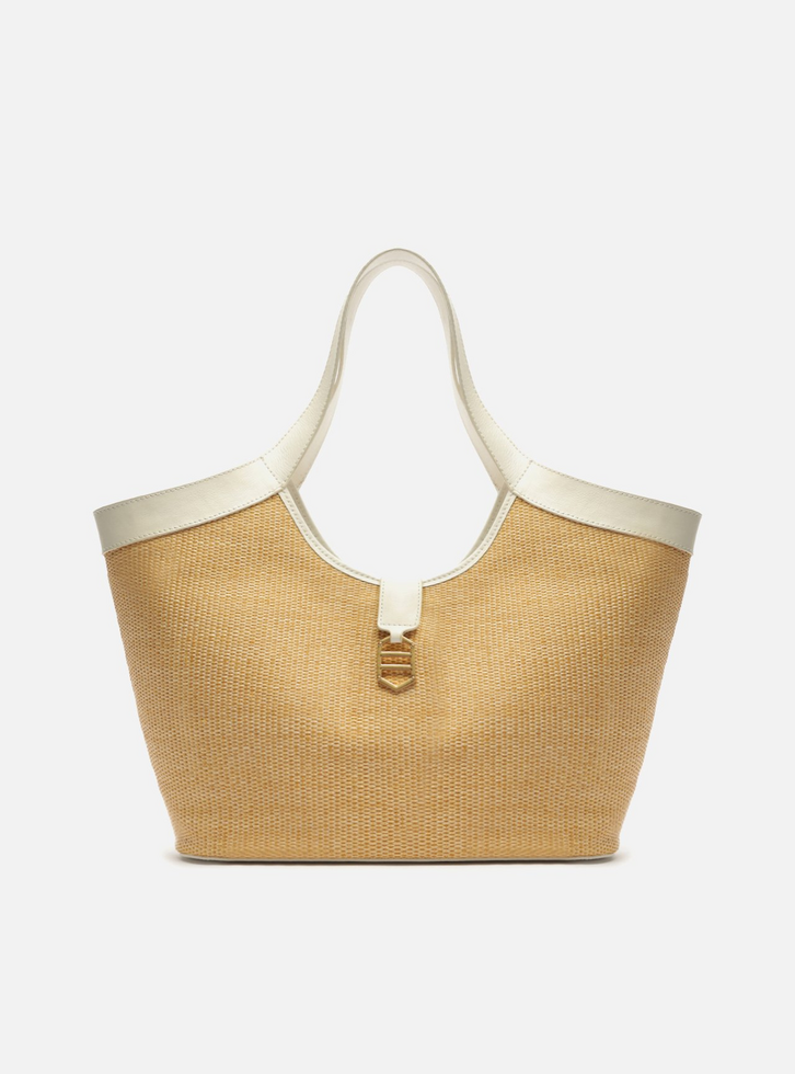 Bolsa shopping feminina grande em palha com detalhes em couro branca. O acessório tem formato amplo e estruturado e corpo em palha tramada. Traz alças de ombro largas em couro e fecho superior com imã e peça metálica geométrica sextavada vazada, que remete à identidade da marca. Possui interior forrado em linho.