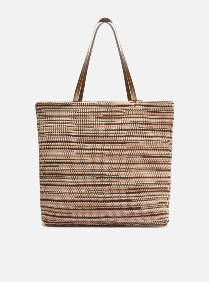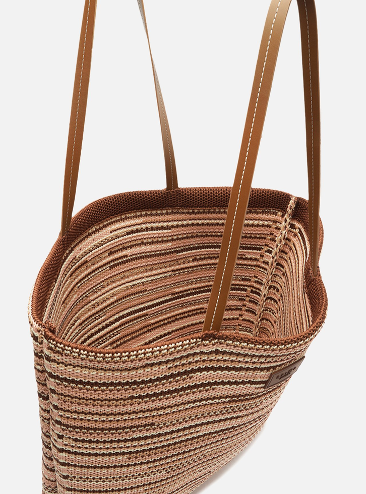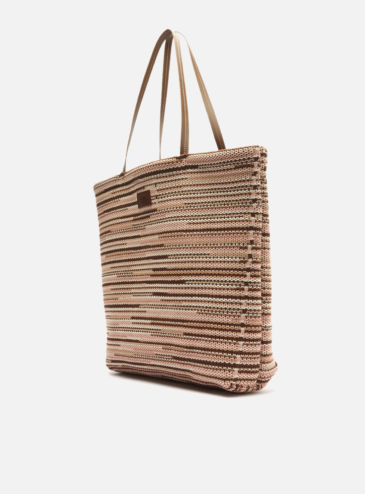 Bolsa shopping grande em tecido. O acessório tem formato amplo, laterais arredondadas e capas tramadas e vazadas. Traz alças de ombro e não possui fechamento. Com tag emborrachada do nome da marca na capa.