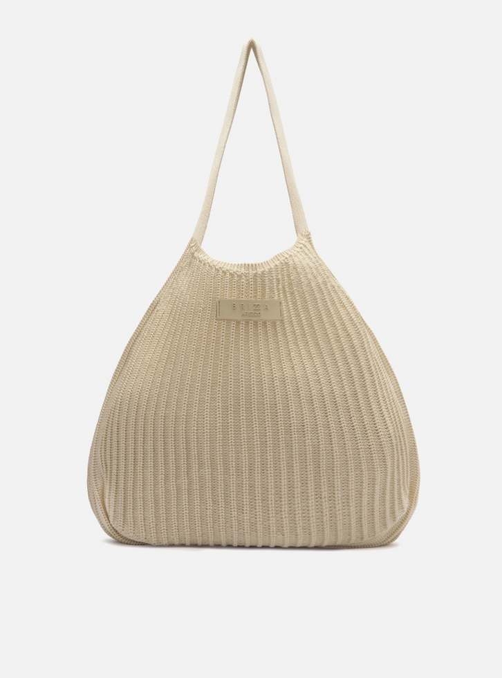 Bolsa shopping grande em tecido e crochê off-white. O acessório tem formato amplo e laterais arredondadas. Traz alça de ombro e não possui fechamento. Com tag emborrachada do nome da marca na capa.
