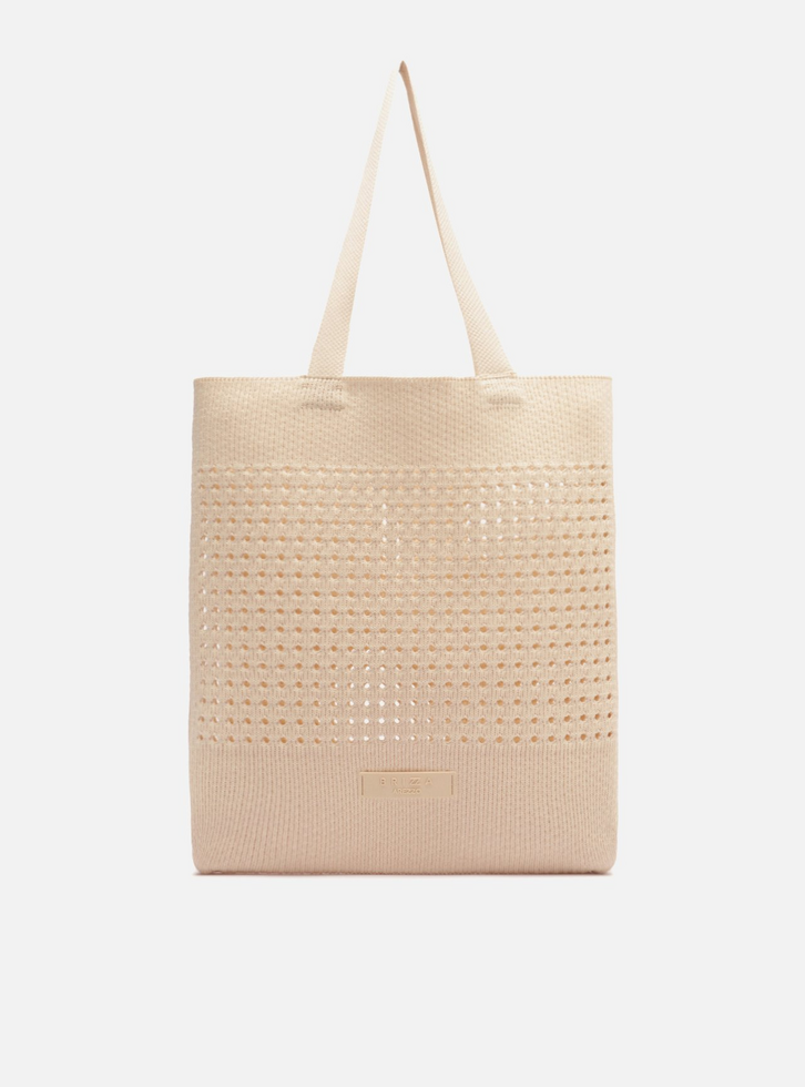 Bolsa shopping grande em crochê off-white. O modelo tem formato amplo, laterais arredondadas e capas tramadas e vazadas. Traz alças e não possui fechamento. Com tag emborrachada do nome da marca na capa.