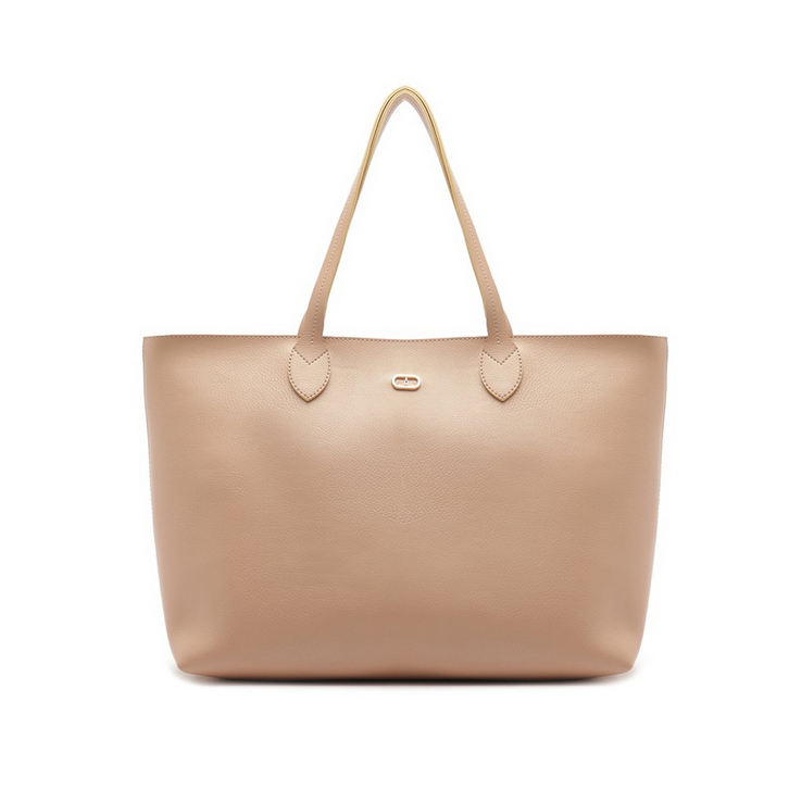 Bolsa shopping grande, na cor bege. O modelo possui duas alças de ombro fixas e dobradas, fecho superior em zíper e puxador em tira. De shape retangular e estruturada, é feita em material similar ao couro com efeito envernizado e traz aplicação de pin metálico em cápsula Anacapri, centralizado na parte superior da capa frontal. Com forro e bolsinho na parte interna.