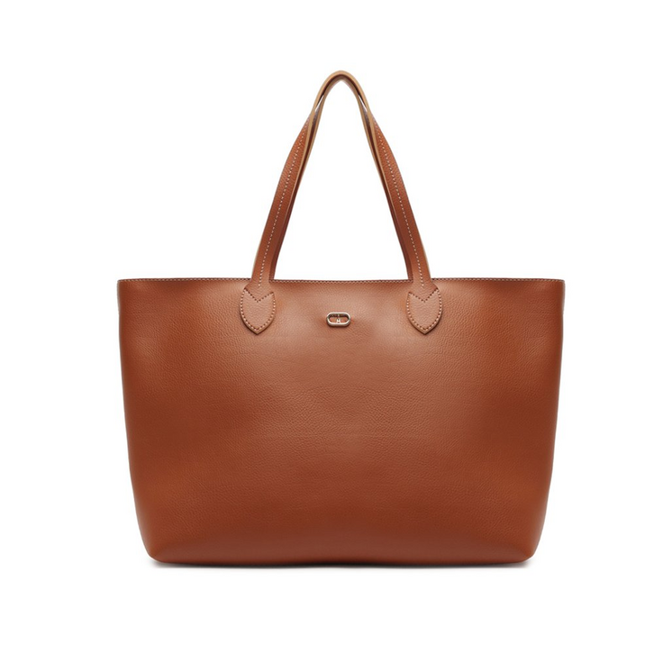 Bolsa shopping grande, na cor marrom. O modelo possui duas alças de ombro fixas e dobradas, fecho superior em zíper e puxador em tira. De shape retangular e estruturada, é feita em material similar ao couro com efeito envernizado e traz aplicação de pin metálico em cápsula Anacapri, centralizado na parte superior da capa frontal. Com forro e bolsinho na parte interna.