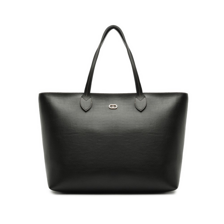 Bolsa shopping grande, na cor preta. O modelo possui duas alças de ombro fixas e dobradas, fecho superior em zíper e puxador em tira. De shape retangular e estruturada, é feita em material similar ao couro com efeito envernizado e traz aplicação de pin metálico em cápsula Anacapri, centralizado na parte superior da capa frontal. Com forro e bolsinho na parte interna.