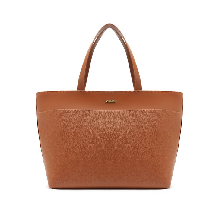 Bolsa shopping grande, com textura, na cor marrom. A bolsa traz shape estruturado e retangular no tamanho grande. O modelo de material similar ao couro, com efeito texturizado, possui alças de ombro fixas. Forrada na parte interna, possui etiqueta emborrachada Anacapri, com inscrição “Descomplica” e maxi bolso aberto, para acomodar itens de acesso rápido. Apresenta fecho superior em zíper com puxador em tira fina. Traz aplicação de pin metálico Anacapri, centralizado na parte superior da capa frontal.