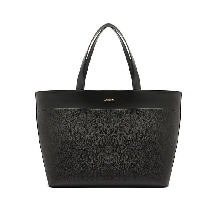 Bolsa shopping grande, com textura, na cor preta. A bolsa traz shape estruturado e retangular no tamanho grande. O modelo de material similar ao couro, com efeito texturizado, possui alças de ombro fixas. Forrada na parte interna, possui etiqueta emborrachada Anacapri, com inscrição “Descomplica” e maxi bolso aberto, para acomodar itens de acesso rápido. Apresenta fecho superior em zíper com puxador em tira fina. Traz aplicação de pin metálico Anacapri, centralizado na parte superior da capa frontal.