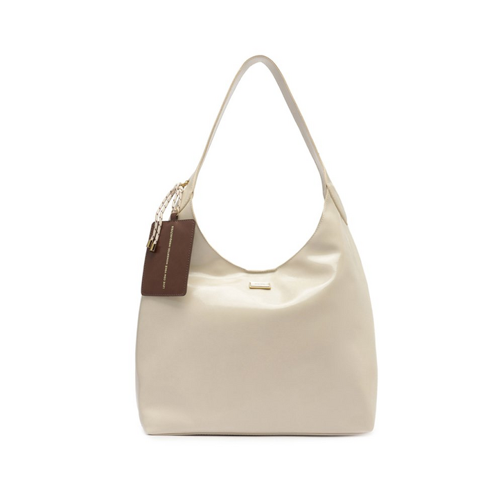 Bolsa shopping boho grande, com porta-cartão, na cor branca. O modelo de material similar ao couro possui shape boho arredondado - com efeito envernizado por toda a peça. No tamanho G, apresenta forro vermelho e bolso interno. Possui alça de ombro larga e confortável, com acabamento a fio no contorno. Com fechamento superior com lapela e botão de ímã. Traz aplicação de placa metálica Anacapri, com dois banhos e acabamento escovado, centralizada na parte superior da capa frontal. Acompanha maxi bag charm com compartimento plastificado - que acomoda cartão ou foto - com arremate em atacador bicolor e ponteiras metálicas. O acessório é removível, podendo ser utilizado separadamente da bolsa.
