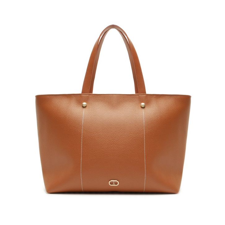 Bolsa shopping grande marrom, em material similar ao couro. O modelo possui shape estruturado retangular e acabamento texturizado com detalhe de costuras e aplicação de rebites na parte frontal. Traz alças de ombro médias, logo metalizado discreto aplicado na base (oval com a letra “A” no interior) e fechamento superior em zíper. Na parte interna, apresenta forro em tom rosé, bolso flat funcional e etiqueta marrom com nome da marca em baixo-relevo.