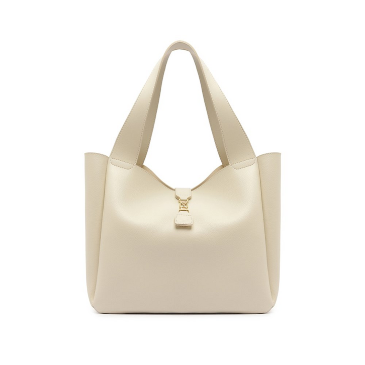 Bolsa shopping grande, com detalhe, na cor branca. No tamanho G, o modelo se renova para a temporada em material similar ao couro, com efeito texturizado e ótimo caimento. De shape estruturado, estilo hobo, ela é forrada e traz bolsinho interno, com fecho em zíper metálico. Com alças de ombro fixas, apresenta fechamento superior por botão de ímã, com detalhe em lapela metálica, com aplicação de pin e inscrição da inicial A - assinatura Anacapri - centralizada no adorno exclusivo.