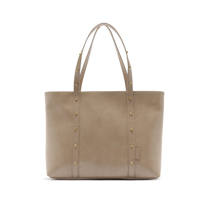 Bolsa shopping grande, com aplicação de studs, na cor bege. O modelo vem para a temporada com shape retangular e estruturado. No tamanho G, de material similar ao couro, possui alças de ombro confortáveis, que seguem para a capa frontal, com aplicação de studs metálicos redondos nas tiras. Com fecho superior em zíper, traz forro vermelho e bolsinho na parte interna. Traz aplicação de etiqueta Anacapri, no mesmo material da peça, na parte inferior lateral da tira, na capa frontal. O modelo comporta notebook com segurança.