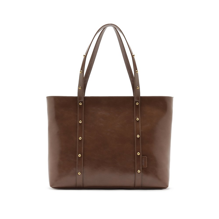 Bolsa shopping grande, com aplicação de studs, na cor marrom. O modelo vem para a temporada com shape retangular e estruturado. No tamanho G, de material similar ao couro, possui alças de ombro confortáveis, que seguem para a capa frontal, com aplicação de studs metálicos redondos nas tiras. Com fecho superior em zíper, traz forro vermelho e bolsinho na parte interna. Traz aplicação de etiqueta Anacapri, no mesmo material da peça, na parte inferior lateral da tira, na capa frontal. O modelo comporta notebook com segurança.