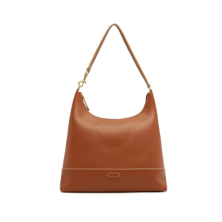 Bolsa hobo grande e texturizada, na cor marrom. No tamanho G, o modelo se renova para a temporada, com material similar ao couro com efeito texturizado e ótimo caimento. De shape estruturado, ela é forrada e traz bolsinho na parte interna. Apresenta fechamento superior em zíper, com puxador em tira. Traz alça de ombro longa com detalhe de mosquetão metálico imponente. O modelo apresenta detalhe inferior na capa frontal com textura tramada, costura a fio contrastante no contorno e aplicação de pin metálico centralizado, com assinatura Anacapri.