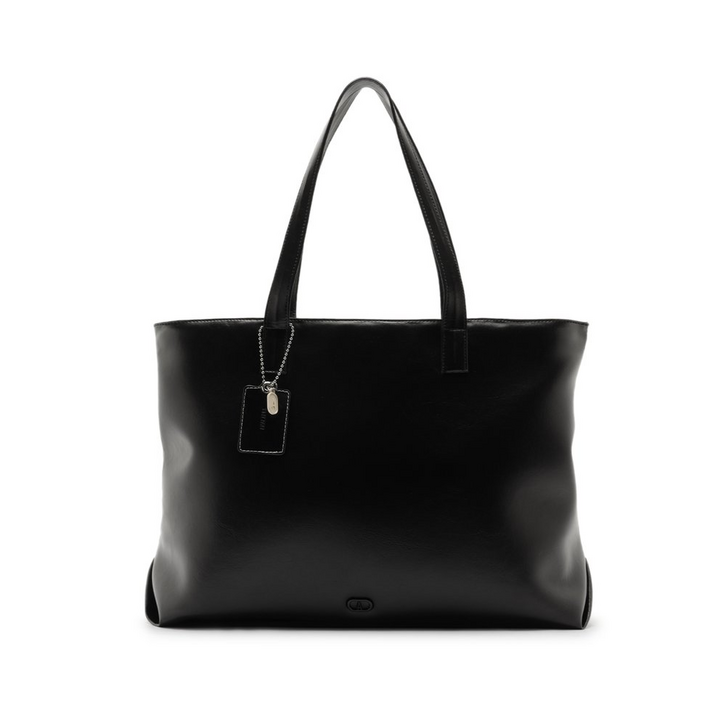 Bolsa shopping grande com bag charm, na cor preta. O modelo possui duas alças de ombro fixas e confortáveis, fecho superior em zíper e puxador em tira. De shape retangular e estruturada, é feita em material similar ao couro com efeito acetinado e traz assinatura Anacapri em relevo e em cápsula, centralizada na parte inferior da capa frontal. Com bolsinho interno, acompanha bag charm no mesmo tom da bolsa, com alcinha em correntaria e pingente metálico colorido. O acessório é removível e pode ser utilizado separadamente da bolsa. O modelo maxi bag comporta notebook com segurança.