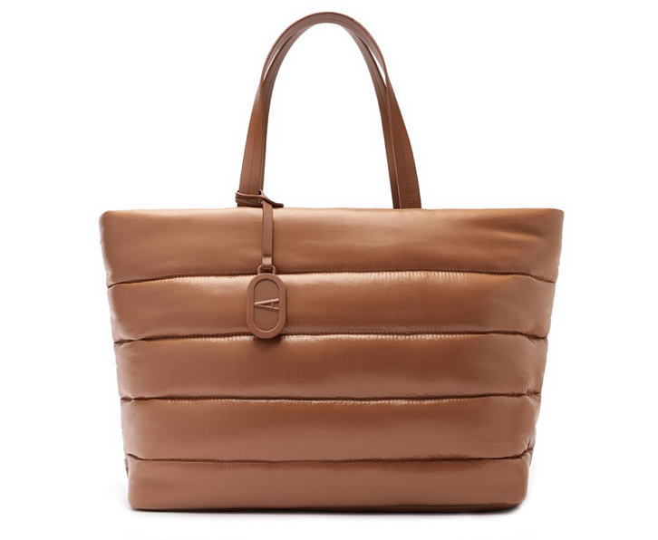 Bolsa shopping grande em nylon, com efeito puffer, na cor marrom. De tamanho grande, possui duas alças de mão em tiras finas com contorno em pesponto e fecho superior em zíper com puxador em tira. O modelo apresenta capas costuradas em matelassê linear com efeito puffer. Forrada na parte interna em tom rosê, a maxi bag comporta notebook e demais eletrônicos com total segurança. Acompanha bag charm emborrachado removível em formato de cápsula com inscrição da inicial A - assinatura Anacapri. O acessório pode ser utilizado separadamente da bolsa.