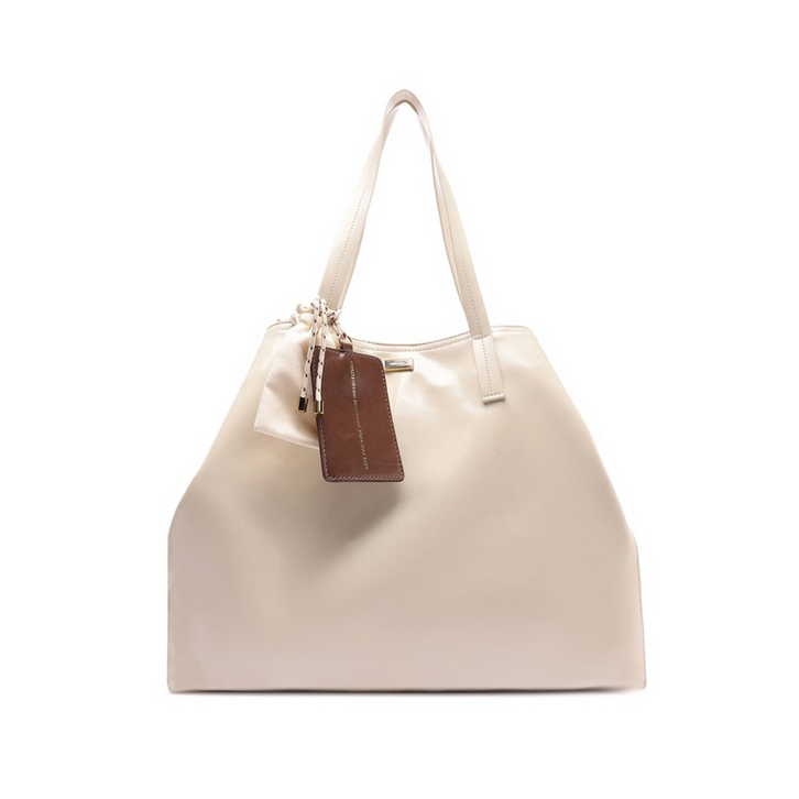 Bolsa shopping grande em verniz, com porta-cartão, na cor branca. O modelo de material similar ao couro possui shape maxi bag - com efeito envernizado por toda a peça. No tamanho G, forro vermelho, bolso interno com fecho em zíper. Possui alças de ombro fixas e fechamento superior em botão de ímã. Traz aplicação de placa metálica Anacapri, com dois banhos e acabamento escovado, centralizada na parte superior da capa frontal. A bolsa comporta notebook com segurança e pode ser utilizada de forma ajustada, ou aberta, como uma bolsa shopping clássica. Acompanha maxi bag charm com compartimento plastificado - que acomoda cartão ou foto - com arremate em atacador bicolor e ponteiras metálicas, com pouch em lona cru. O acessório é removível, podendo ser utilizado separadamente da bolsa. Porque Apostar: Bolsa shopping é um vício das descomplicadas. O modelo vem para a temporada Resort’26 Anacapri com shape moderninho que pode ser utilizado tanto aberto, quanto mais ajustado: apresenta material sofisticado, com acabamento envernizado. O bag charm personalizado e funcional acomoda cartão ou foto, permitindo inúmeras combinações e auxiliando em viagens para identificação. Ícone que chama, né?