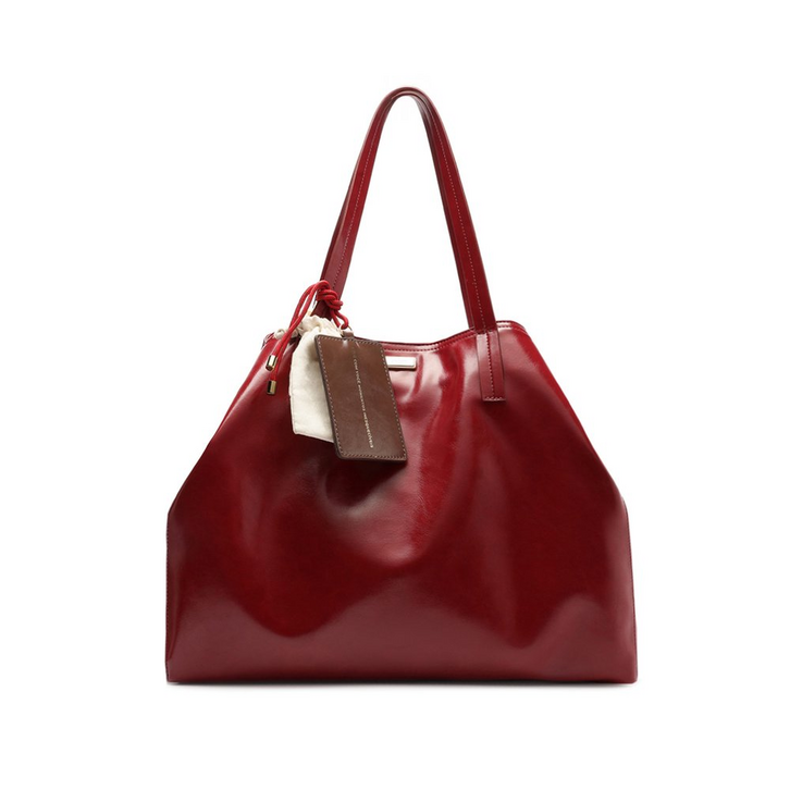 Bolsa shopping grande em verniz, com porta-cartão, na cor vermelha. O modelo de material similar ao couro possui shape maxi bag - com efeito envernizado por toda a peça. No tamanho G, forro vermelho, bolso interno com fecho em zíper. Possui alças de ombro fixas e fechamento superior em botão de ímã. Traz aplicação de placa metálica Anacapri, com dois banhos e acabamento escovado, centralizada na parte superior da capa frontal. A bolsa comporta notebook com segurança e pode ser utilizada de forma ajustada, ou aberta, como uma bolsa shopping clássica. Acompanha maxi bag charm com compartimento plastificado - que acomoda cartão ou foto - com arremate em atacador bicolor e ponteiras metálicas, com pouch em lona cru. O acessório é removível, podendo ser utilizado separadamente da bolsa.