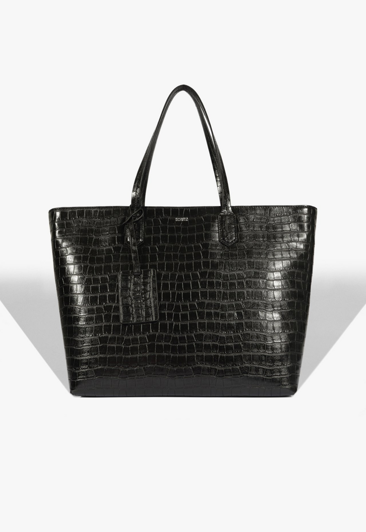 O design sofisticado desta bolsa shopping preta destaca esse modelo na categoria! Glamurosa com seu acabamento em couro croco com leve brilho, ela conta amplo espaço interno para levar tudo que você precisa. Com detalhe da charmosa tag de couro, vai ser aquela bolsa elegante, prática e estilosa para te acompanhar sempre! Comprimento da alça: 19 cm | Largura da alça: 1,5 cm