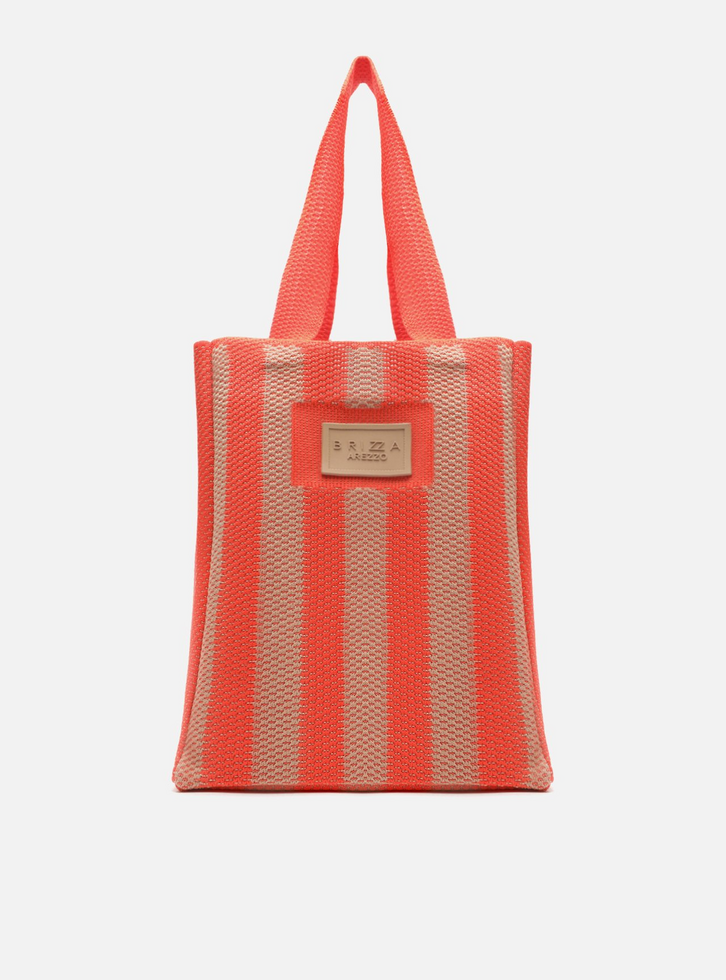 Bolsa shopping grande em crochê laranja e marrom com listradas verticais. O acessório tem formato amplo e capas tramadas. Traz alças de ombro e não possui fechamento. Com tag emborrachada do nome da marca na capa.