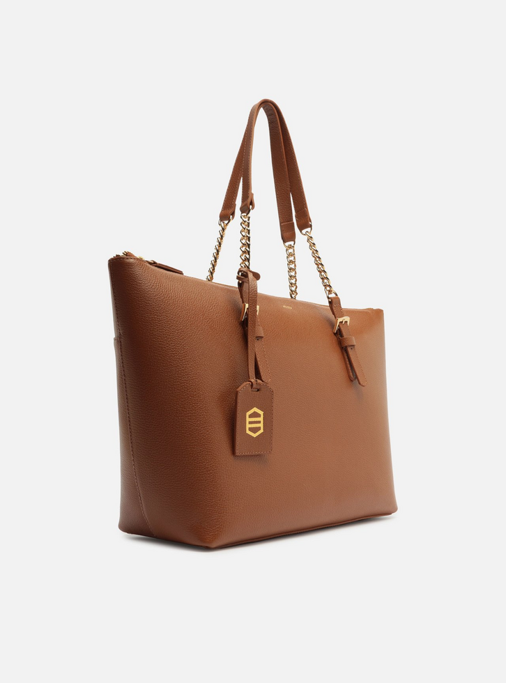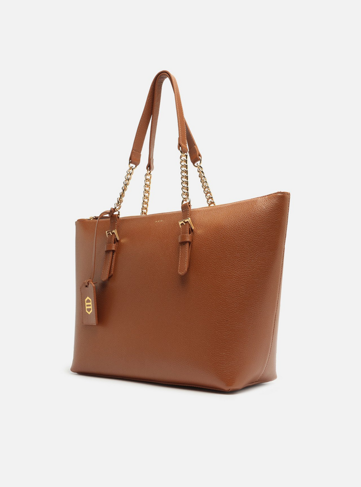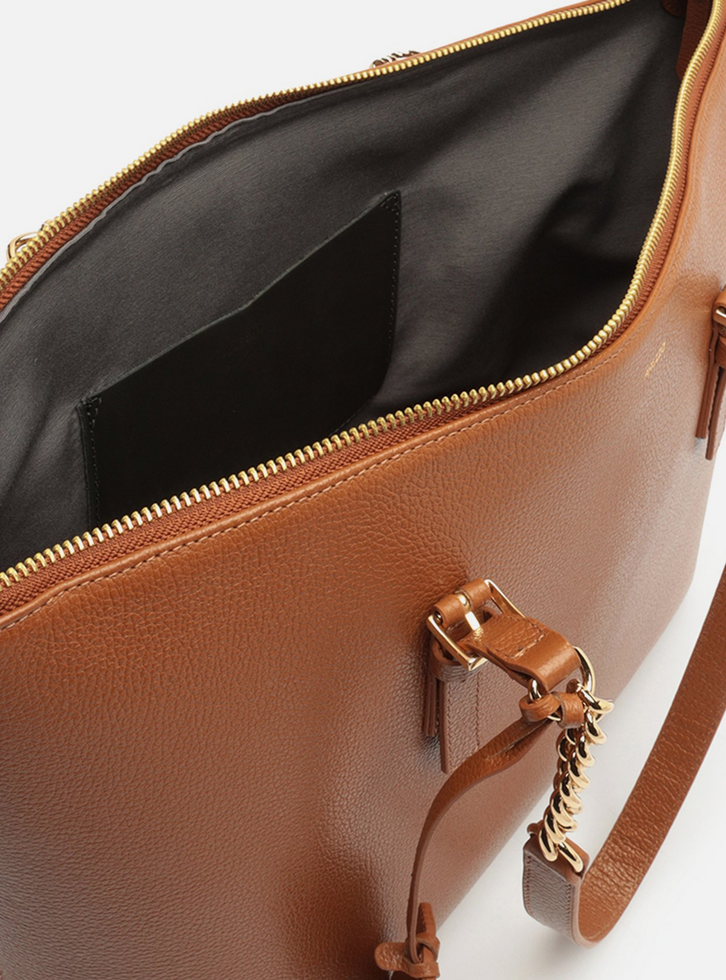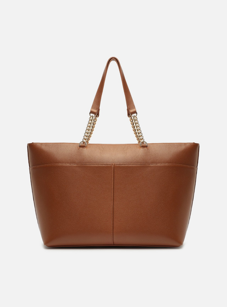 Bolsa feminina shopping grande em couro marrom. O acessório tem formato estruturado e acabamento levemente texturizado. Possui duas alças de ombro em tiras de couro, presas por correntes metálicas douradas e que terminam novamente em tiras de couro com ajuste em fivelas. Conta com fecho superior em zíper com puxador e interior amplo. Acompanha bag charm preso por tira à bolsa, com detalhe em metal geométrico dourado.