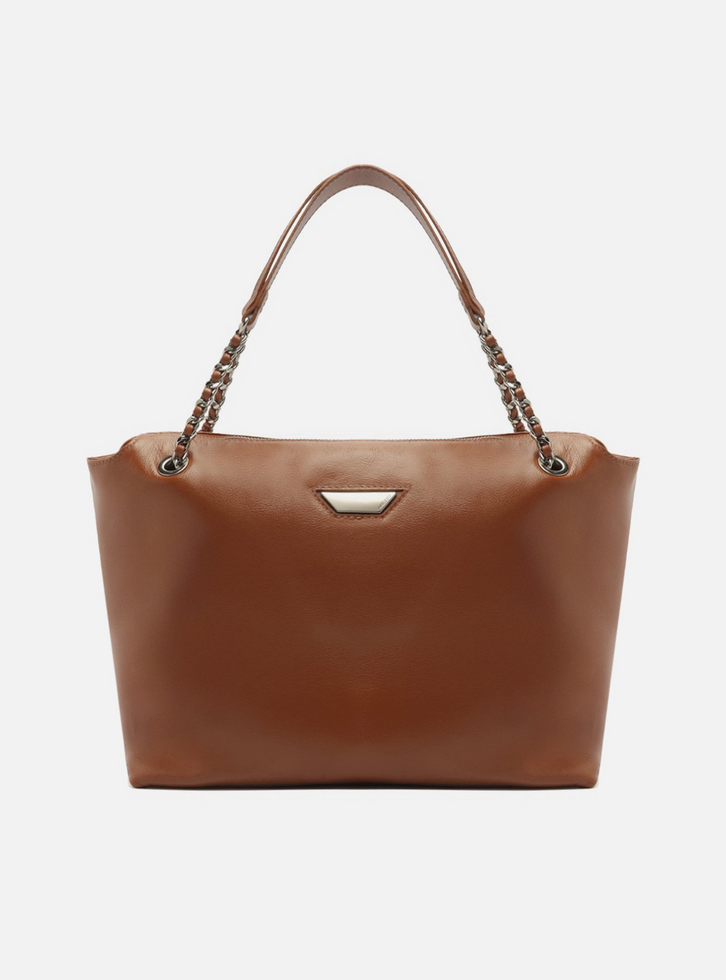Bolsa shopping grande de couro marrom. O acessório tem formato estruturado. Traz alças de ombro em corrente metálica com tira de couro transpassada e ombreiras. Possui fecho em zíper, puxador e detalhe em metal geométrico com nome da marca na capa.