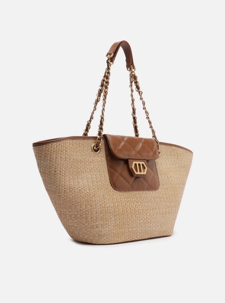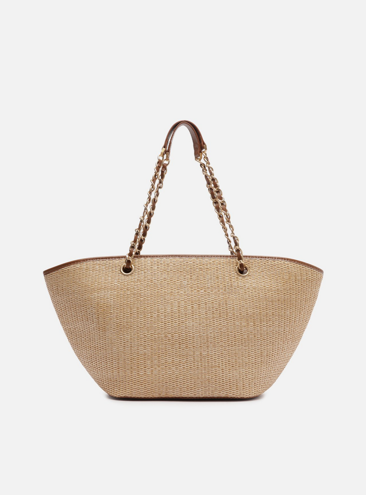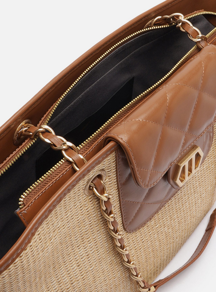 Bolsa shopping grande em ráfia natural com detalhes em couro marrom. O acessório tem formato estruturado, mais estreito na base, e acabamento tramado. Traz alças de ombro em correntes metálicas com tiras de couro entrelaçadas e ombreiras. Possui bolso frontal em couro com acabamento em matelassê e fecho em tampo com peça metálica. Fecho superior em zíper com puxador.