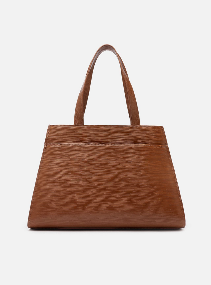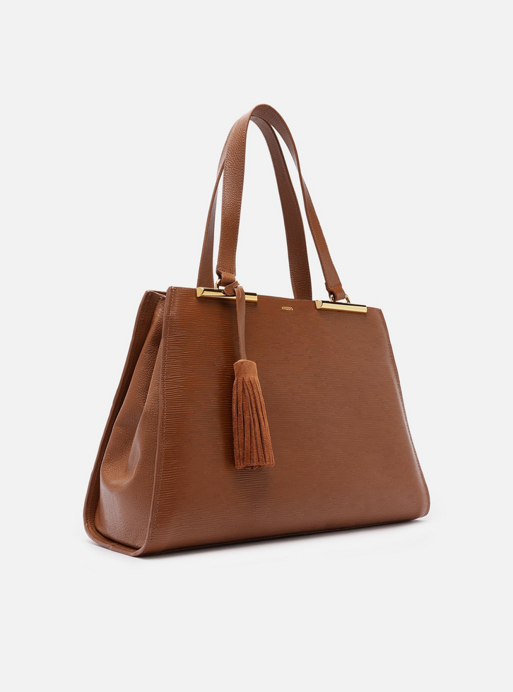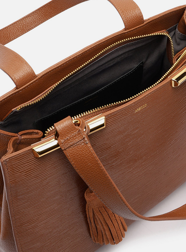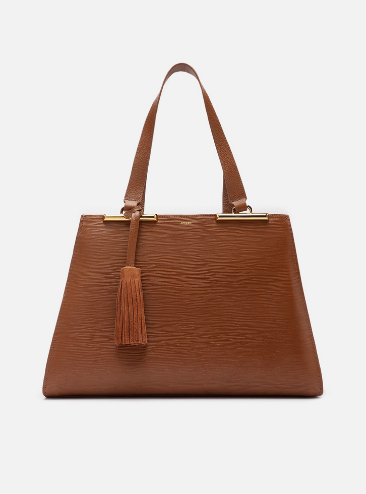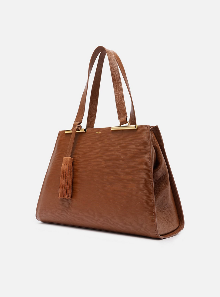 Bolsa shopping grande de couro marrom. O acessório tem formato estruturado, acabamento texturizado wave, base mais larga e inscrição discreta do nome da marca. Traz alças de ombro presas por metais dourados na base. Com fecho superior em zíper e puxador em tira. Acompanha bag charm em barbicacho de camurcina, preso à bolsa por tira fina.