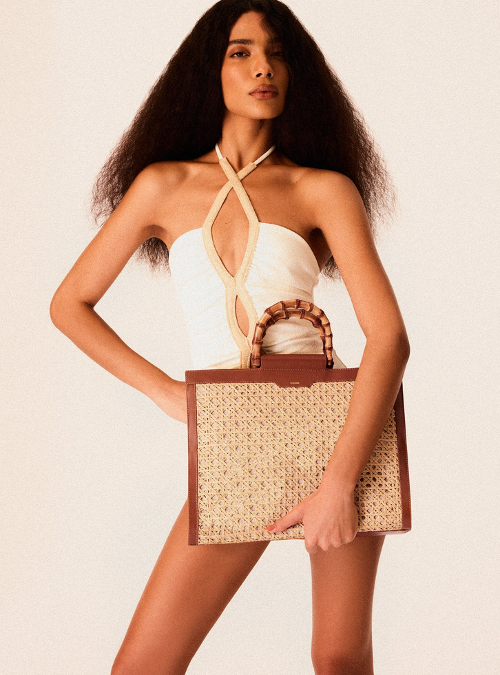 Bolsa shopping grande em palha natural e couro marrom. O acessório tem formato estruturado, com capas em palhinha tramada natural e moldura em couro marrom. Traz alça lateral fina, regulável e removível, além de alças de mão em bambu. Possui fecho superior em zíper.