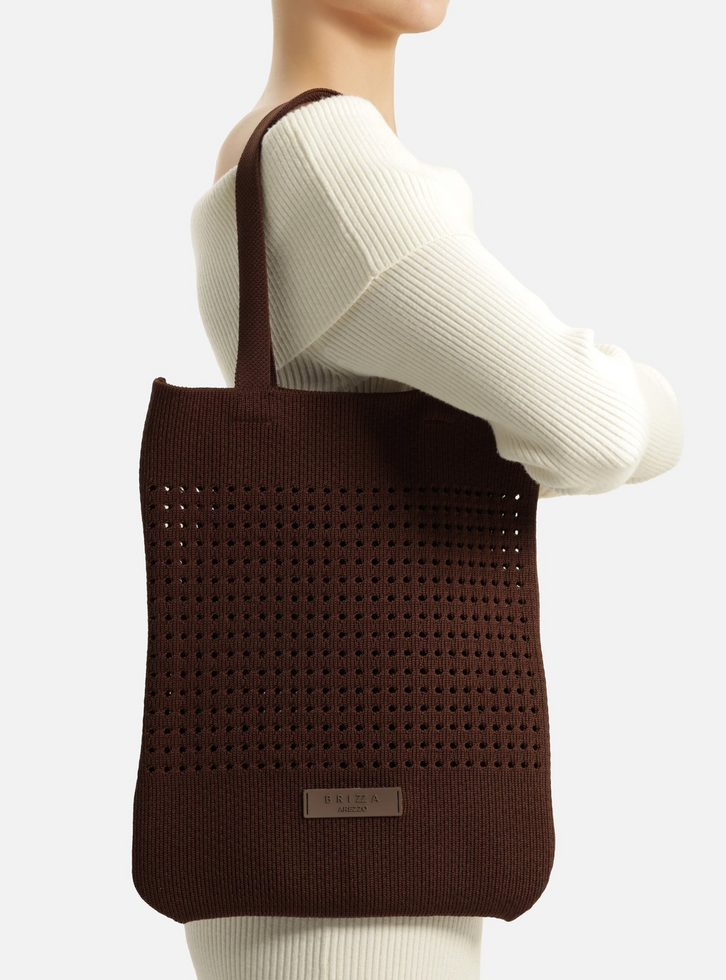 Bolsa shopping grande em crochê marrom. O acessório tem formato maleável e traz pontos vazados, além de etiqueta do nome da marca na parte frontal. Possui alça dupla para uso no ombro.