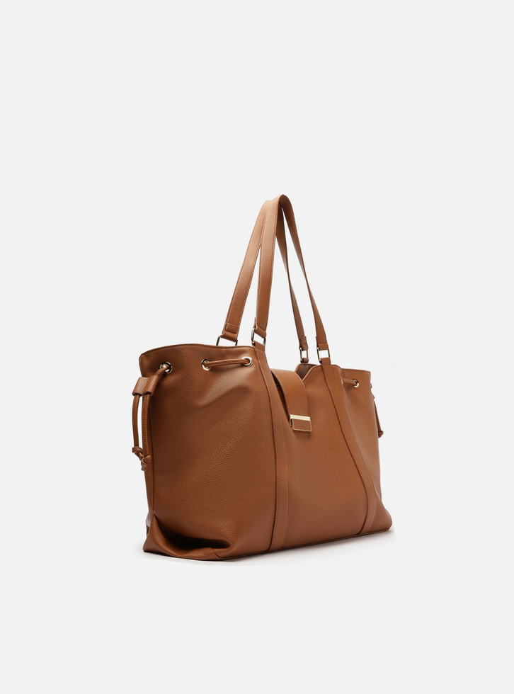 Bolsa shopping grande marrom. A bolsa tem formato estruturado e tiras sobre as capas. Traz duas alças de ombro com metais e fecho superior. Possui ilhoses em toda a parte superior e tira que passa entre eles, além de peça com detalhe metálico ao centro.