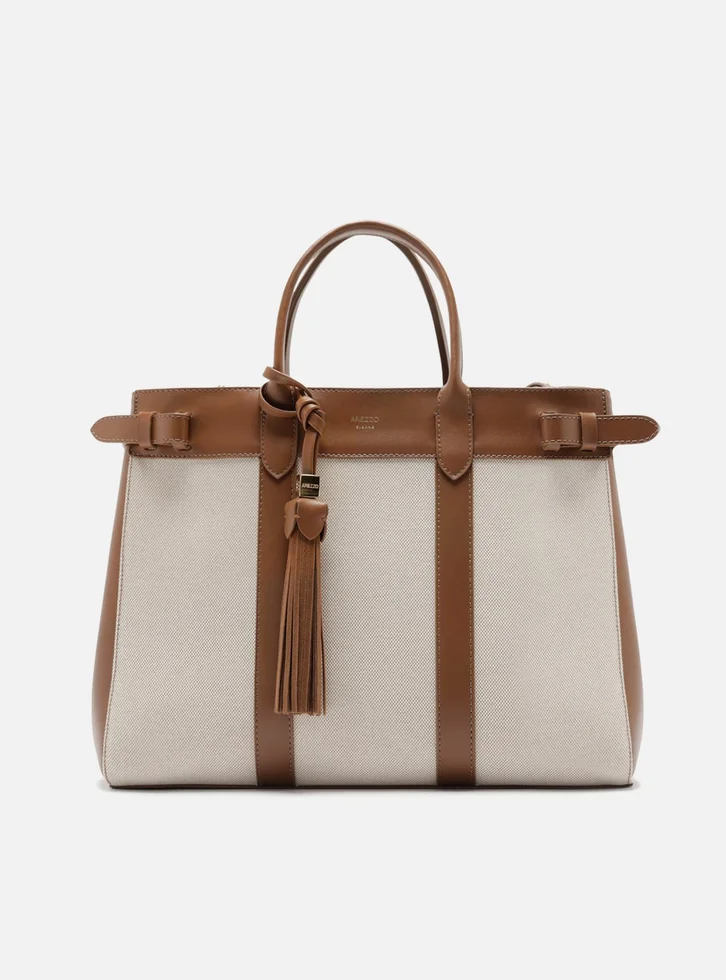 Bolsa shopping grande em linho com detalhes em material marrom. O acessório tem formato estruturado, capa em linho e tiras sobrepostas marrons. Traz duas alças de mão e alça tiracolo regulável. Possui detalhe em tiras nas laterais da parte superior, como extensores, e fecho superior em zíper. Conta ainda com bag charm em barbicacho de camurcina e metal, preso à alça da bolsa por tira.