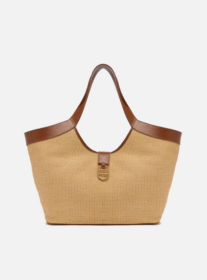 Bolsa shopping feminina grande em palha com detalhes em couro marrom. O acessório tem formato amplo e estruturado e corpo em palha tramada. Traz alças de ombro largas em couro e fecho superior com imã e peça metálica geométrica sextavada vazada, que remete à identidade da marca. Possui interior forrado em linho.