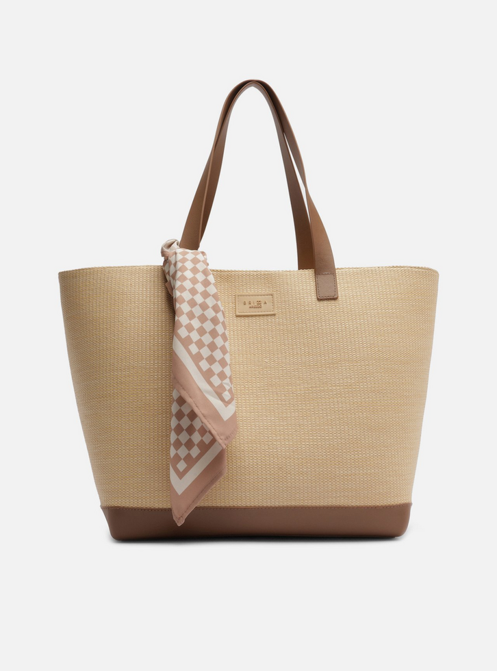 Bolsa shopping grande em ráfia tramada bege e marrom. O acessório tem formato estruturado e base em PVC, além de alças de ombro em PVC marrom. Possui fechamento superior em zíper, etiqueta personalizada na parte frontal e acompanha lenço removível com estampa xadrez marrom.