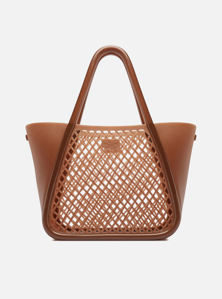 Bolsa shopping grande marrom em PVC leitoso. O acessório tem formato estruturado, laterais estendidas e capas vazadas. Traz duas alças de ombro contínuas à bolsa até a base e tag emborrachada com nome da marca na capa.