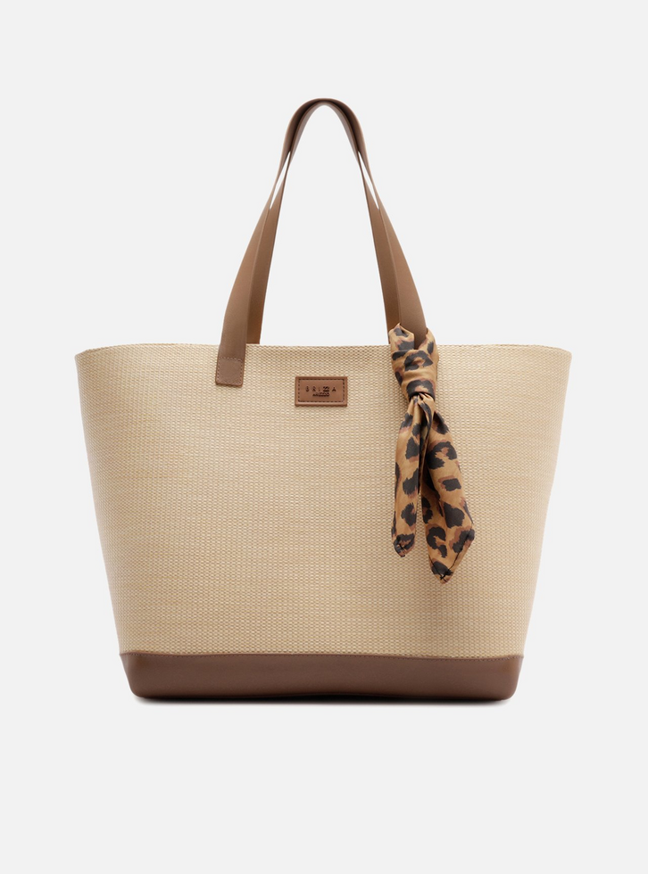 Bolsa shopping grande em material tramado bege com base em PVC marrom. De formato estruturado, o acessório traz duas alças de ombro, fechamento superior em zíper e etiqueta Brizza aplicada na parte frontal. Vem acompanhada de lenço estampado animal print amarrado a uma das alças.