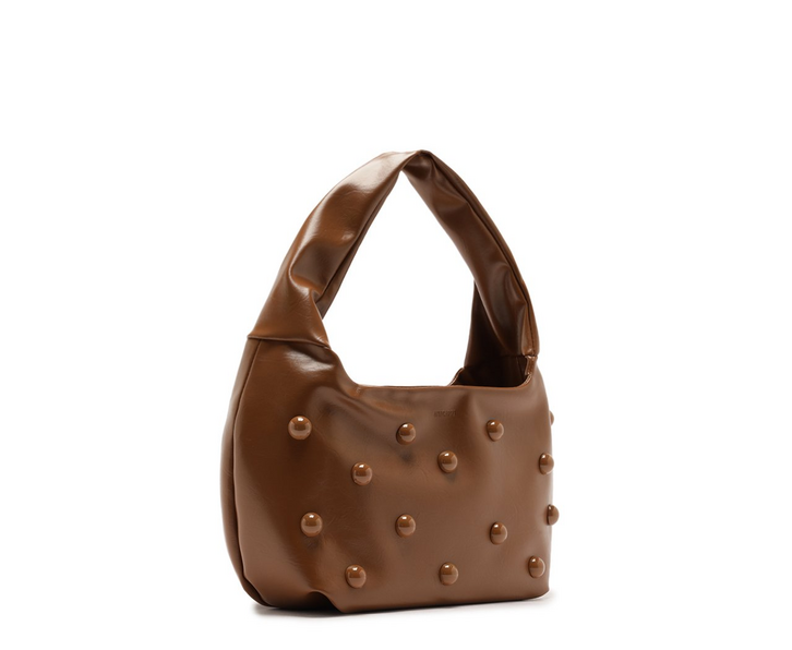 Bolsa hobo média, com detalhe em esferas, na cor marrom. No tamanho M, o modelo se renova para a temporada, com material similar ao couro e ótimo caimento. Apresenta um shape molinho com efeito soft e aplicação de maxi esferas em resina, no mesmo tom da peça, na capa frontal. Apresenta fechamento superior em zíper, com puxador em tira. Traz alça de ombro fixa, mais larga e comfy.