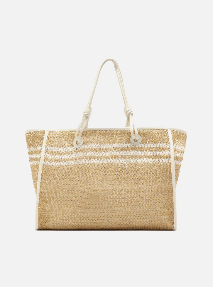 Bolsa feminina shopping grande em palha natural tramada. O acessório tem formato estruturado, laterais amplas e fechamento superior em tira com amarração. Possui contorno e alças em off-white, com faixas nas capas em off-white e palha. As alças são formadas por tiras duplas com detalhe enrolado na base e passam por ilhoses na parte superior. Conta com tag do nome da marca na lateral.