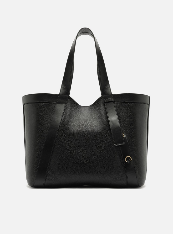Bolsa shopping grande preta de couro. O acessório tem formato estruturado e acabamento macio. Traz duas alças de ombro costuradas às capas, sendo uma delas solta, com passador e detalhe em metal na ponta. Sob essa alça, metais em argolas aplicados na capa frontal. Possui fecho em imã.